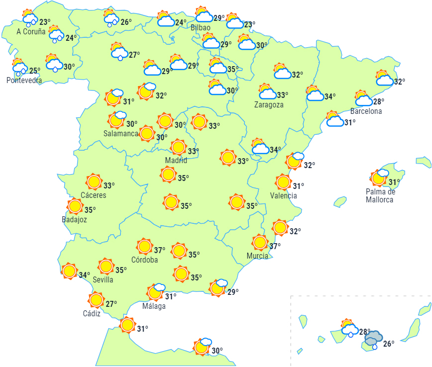 Det meste af landet vil have letskyet himmel, men over Galicien, ved Det Cantabriske Hav, over det østlige Spanien og De Baleariske Øer forventes der overskyet i perioder om morgenen, som i det sydøstlige indland og på Valencias kyst kan give nogle byger.