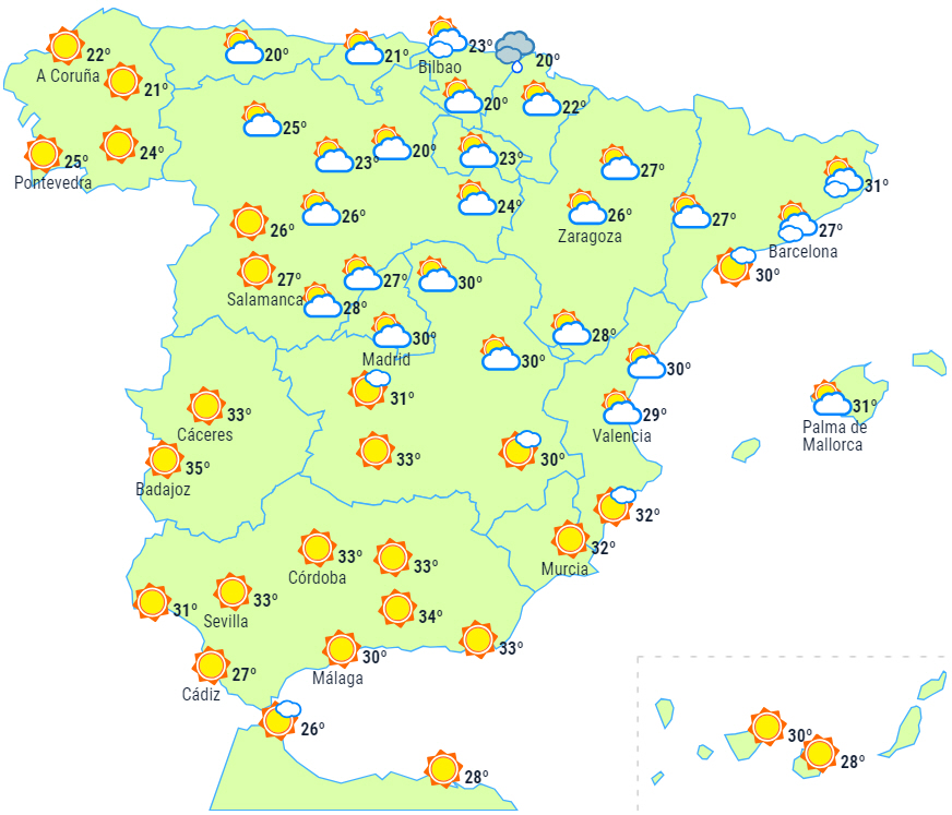 Temperaturerne stiger på De Kanariske Øer, men mere markant i de indre områder. Temperaturerne vil overstige 34 til 36 grader i det meste af det indre af den sydlige halvdel af halvøen, Ebro-dalen og på De Kanariske Øer, mens vi endda kan ramme 38 til 40 grader i dalene på den sydvestlige del af halvøen. Nattemperaturerne vil ikke falde til under 22 til 24 grader i Middelhavsområdet og den sydvestlige del.