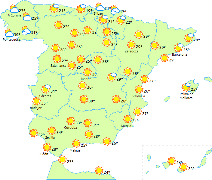 Dagstemperaturerne stiger over hele linjen, men varmest med over 30 grader i det indre af den sydvestlige del af halvøen og måske også i dalene i det sydlige Galicien samt i Huesca og Lleida. Minimumstemperaturerne vil stige i halvøens indre egne. Kun få ændringer i resten af landet.