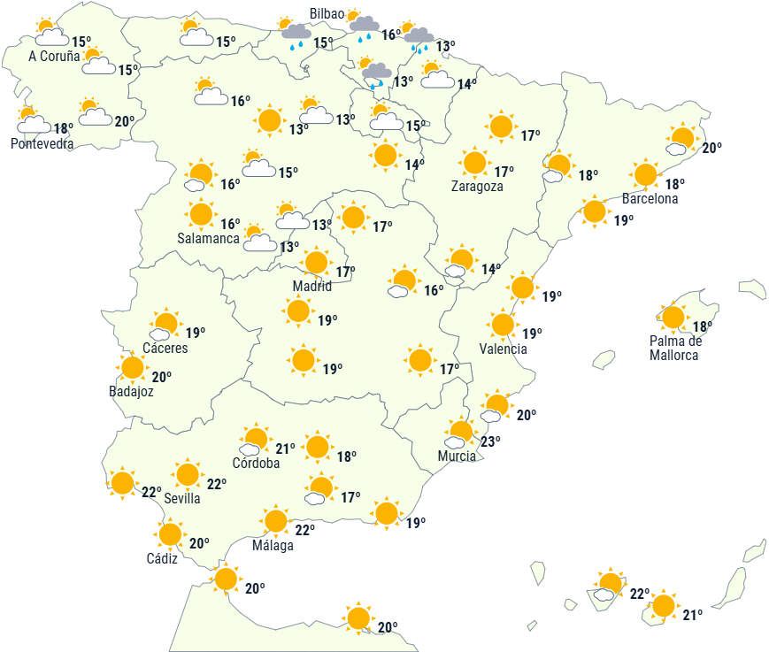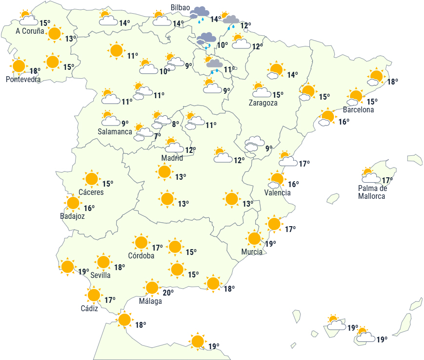 Der forventes fortsat stabilt vejr på Den Iberiske Halvø og De Baleariske Øer med overvejende letskyet eller klar himmel og kun svag nedbør, der primært rammer det østlige Cantábrico, den nordlige del af halvøen og Pyrenæernes nordside, hvor det kan falde som sne i højder fra mellem 1.400 og 1.800 meter.