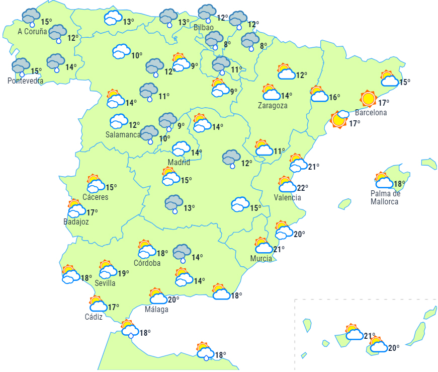 Dagstemperaturerne har tendens til at stige på Middelhavskysten, i Ebro-dalen, på Balearerne og langs den cantabriske kyst, mens de falder næsten overalt inde i landet. Nattemperaturerne stiger på den nordlige halvdel og Balearerne. Kun få ændringer på De Kanariske Øer. Svag frost i Pyrenæerne.