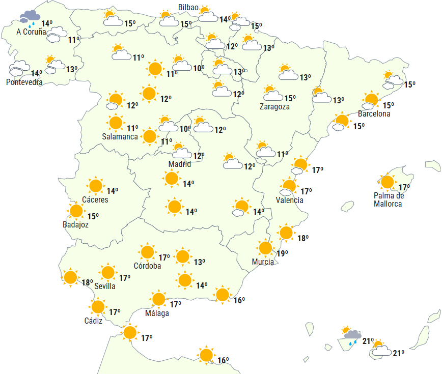 Der forventes en stabil situation på Den Iberiske Halvø med overvejende klar eller skyfri himmel bortset fra over den nordlige tredjedel, hvor der vil være letskyet eller overskyet med sandsynlighed for svage og lejlighedsvise byger i det nordlige Galicien, De Iberiske Bjerge, den øvre Ebro-dal, Cantabrien og Pyrenæerne, hvor det vil sne i højder, der stiger fra 800/1.000 meter op til 1.500/1.800 meter.