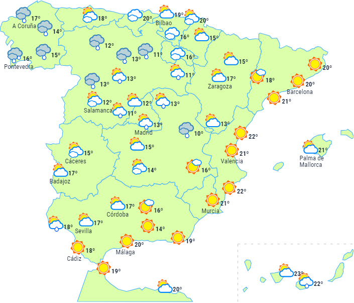 Men så tager skyerne til i nordvest, og det giver nedbør i Galicien og de omkringliggende områder, den østlige ende af nordvestkysten, de vestlige Pyrenæer og den vestlige del af de centrale bjerge. Regnen vil være kraftigere i Galicien og kan lokalt være kraftig eller vedvarende og lejlighedsvis ledsaget af tordenvejr ved kysten.