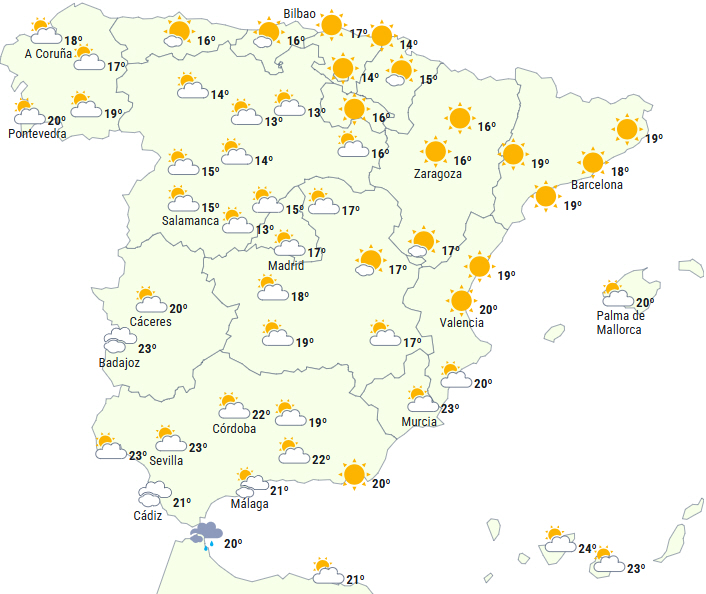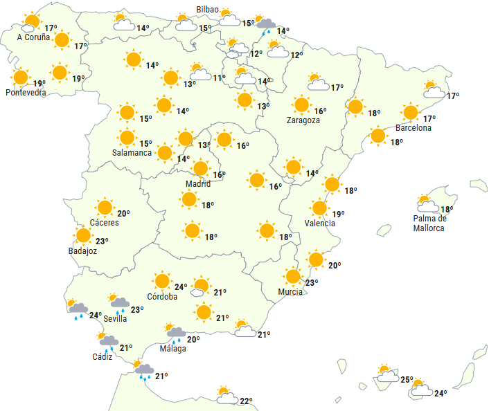 Der forventes mere stabilt vejr til den nordlige tredjedel af Den Iberiske Halvø. Dagens starter dog med lavthængende skyer, men det klarer hurtigt op, bortset fra i den østlige ende af Cantábrico og det nordlige Navarra, hvor det vil være mere vedvarende og sandsynligvis kaste noget regn eller svag støvregn af sig.