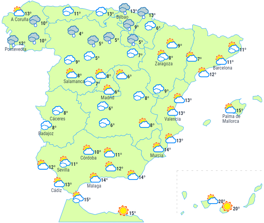 Nedbøren vil være begrænset til Galicien, Asturien og det nordvestlige Castilla y León og vil være mere udbredt i det vestlige Galicien, hvor den kan være vedvarende, men den vil have tendens til at aftage i løbet af dagen.