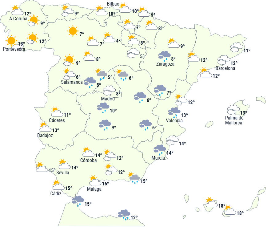 En lavtrykszone sydvest for Den Iberiske Halvø vil give overvejende skyet eller overskyet himmel med let nedbør, der påvirker det meste af den sydlige halvdel af halvøen, Cantabrien og området omkring Pyrenæerne, men også mulighed for enkelte byger i resten af landet.