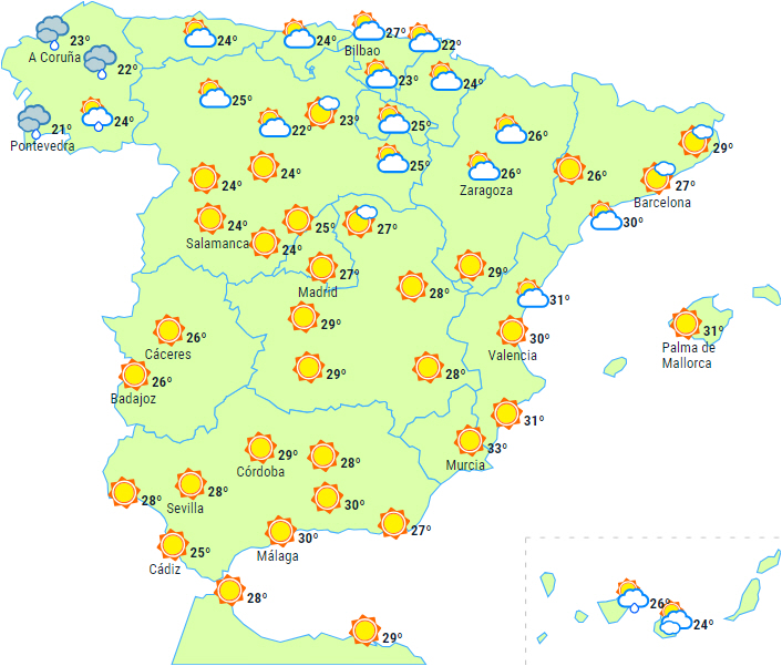 Dagstemperaturerne har tendens til at falde i det indre af den nordlige tredjedel og på De Kanariske Øer, mens de igen stiger i resten. Temperaturerne vil overstige 34 til 36 grader i det indre af den sydlige halvdel af halvøen, Ebro-dalen og Mallorca, og vi kan endda lejlighedsvis nå 40 grader i Guadalquivir. Nattemperaturerne vil stige på den nordlige tredjedel af halvøen og i det vestlige Andalusien, mens de vil falde i resten af landet.