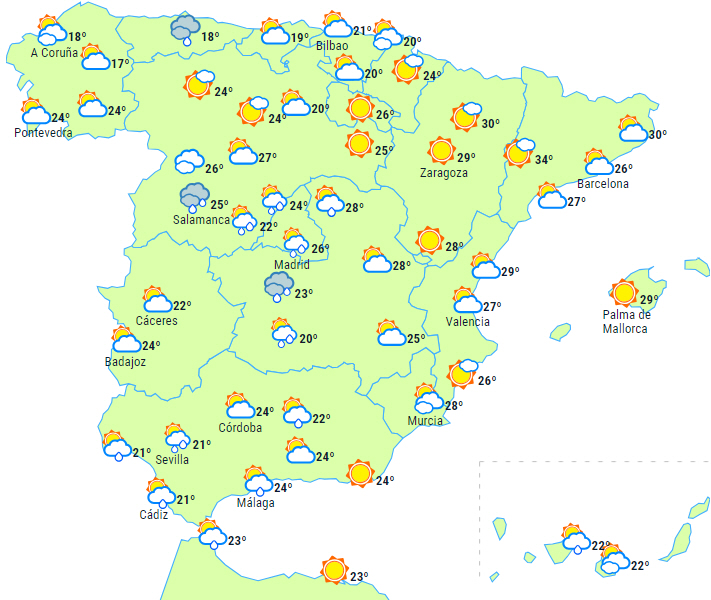 Med en vis usikkerhed om, hvad retning den tager, er det sandsynligt, at DANAen fortsat vil påvirke halvøen. Det betyder rigeligt med skydække og byger og tordenvejr, der bevæger sig fra syd mod nord og påvirker det meste af fastlandet. Nedbøren kan lokalt være kraftig i områder i syd og centrum, i indlandet i nordvest, det nordlige af De Iberiske Bjerge og den øvre Ebro-dal og i de sene timer også indlandet mod øst og sydøst - generelt altså dog aftagende fra syd. Hagl kan forekomme lokalt.