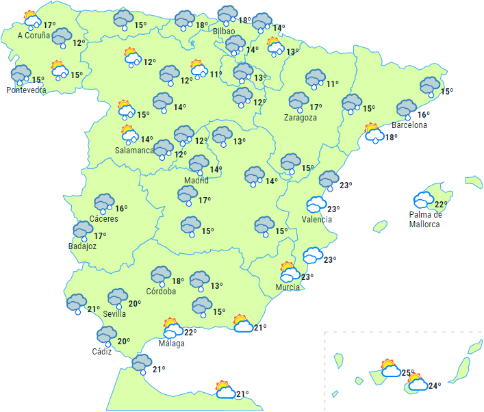 Skyet eller overskyet himmel over den nordlige tredjedel af halvøen og Balearerne med regn og byger, som lokalt kan være kraftige og med torden.