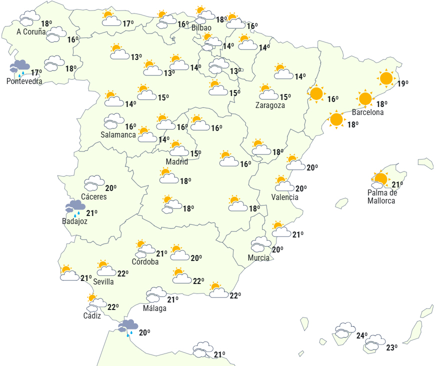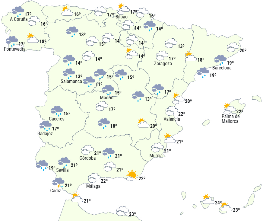 Ved døgnets slutning forventes det, at nedbøren vil være vedvarende i den vestlige del af højlandet og i Andalusien med sandsynlighed for lokalt kraftige byger og lejlighedsvise tordenvejr.
