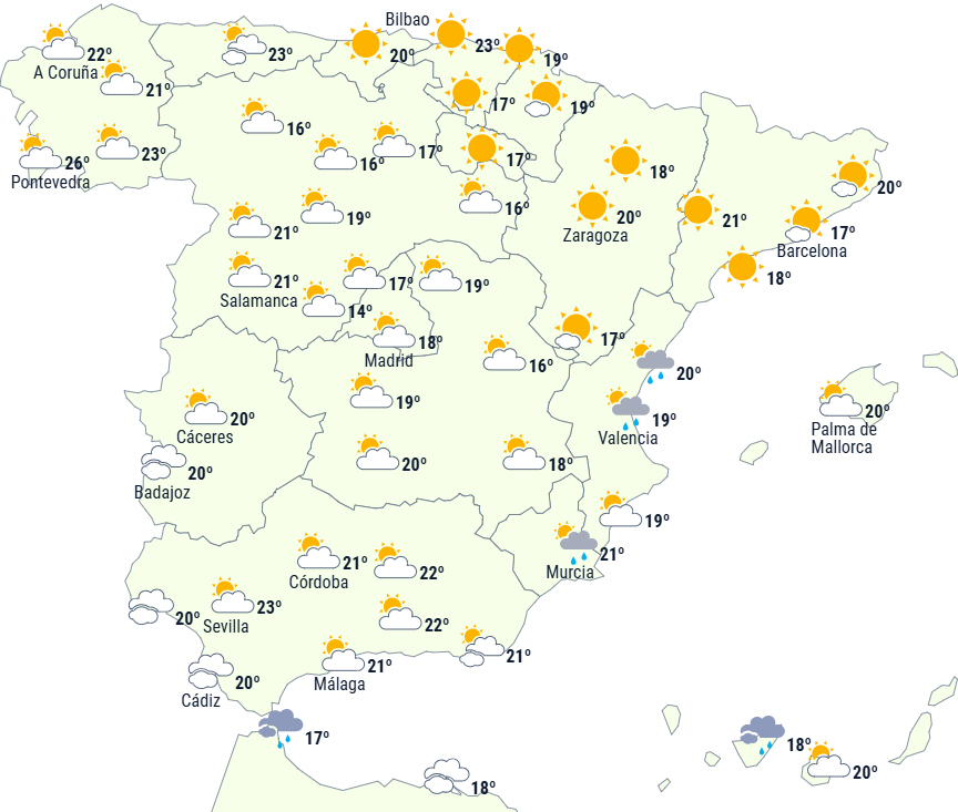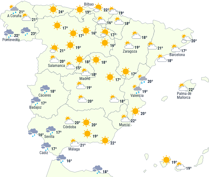 Dagstemperaturerne falder ved Den Iberiske Halvøs østlige og sydøstlige kyster samt på De Kanariske Øer, mens de stiger på resten af halvø og De Baleariske Øer.
