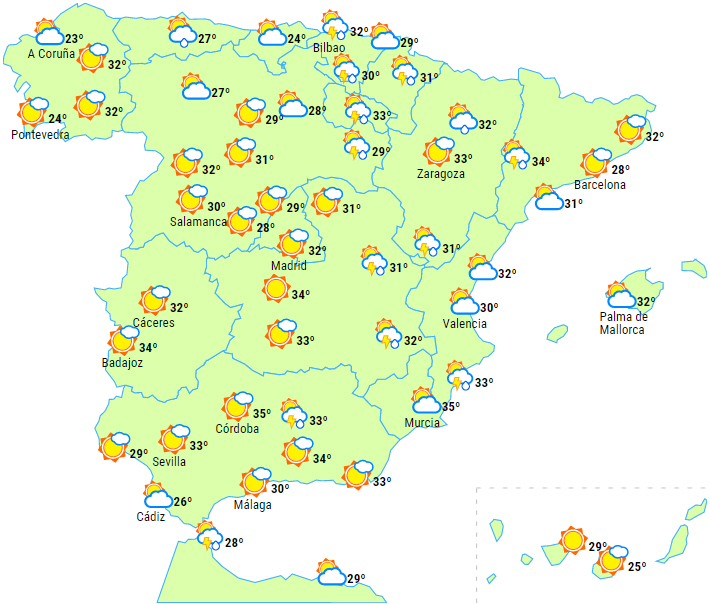 Dagstemperaturerne vil stige i Middelhavsområdet og på De Kanariske Øer og falde i resten af landet. Temperaturerne forventes at overstige 35 grader i Guadalquivir, det helt nordøstlige af Catalonien og dele af det østlige Andalusien. Minimumstemperaturerne vil falde på den vestlige tredjedel af halvøen og vil stige på Balearerne og resten af halvøen. Kun få ændringer på De Kanariske Øer.