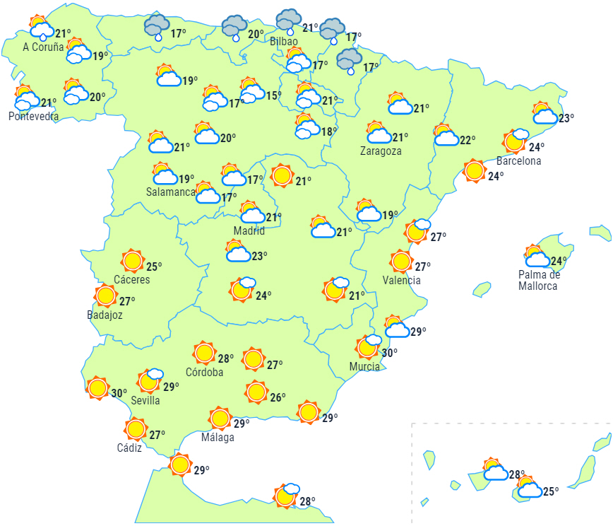 I resten af landet lette skyer til den nordlige halvdel af halvøen, hvor der er overskyet i perioder, når skyerne bevæger sig fra nordvest til sydøst, og også perioder med lavthængende skyer over de nordlige dele af De Kanariske Øer.