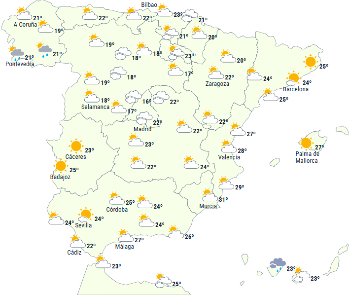 Dagstemperaturerne vil falde på De Baleariske Øer og ved halvøens sydøstkyst, mens der ventes stigninger på resten af Den Iberiske Halvø. Lokalt kan temperaturen overstige 35 grader lokalt ved det sydlige Middelhav og Guadalquivir.