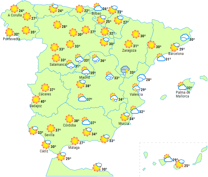 I løbet af eftermiddagen vil der udvikle sig skyer i de centrale og østlige dele af halvøen, og det giver igen regn- og tordenvejr i Aragon, Catalonien og den nordlige del af Valencia.