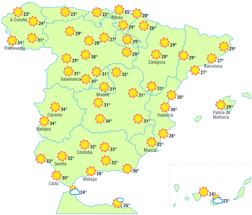 Maksimumtemperaturerne forbliver over 35 grader i det meste af halvøens indre egne og Balearerne, måske endda 40 til 42 grader på den sydvestlige del og den nordøstlige tredjedel.