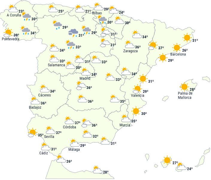 Dermed forventes vi at overstige 34 til 36 grader på det meste af den sydlige halvdel af Den Iberiske Halvø og i det nordøstlige indland, samt i områder af det nordlige højland og endda lokalt i dalområder i nordvest. Der er sandsynlighed for at overstige 38 og endda 40 grader i Guadalquivir-området samt på enkelte steder i Guadiana og de nordøstlige dale. På De Kanariske Øer forventes ingen ændringer.