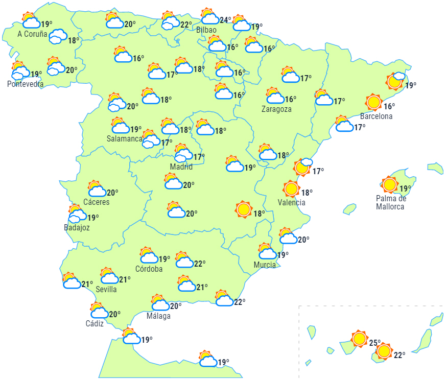 Letskyet eller klart i resten af landet, med lavtliggende skyer om morgenen over det sydlige Catalonien og området omkring Gibraltarstrædet og højtliggende skyer ellers over det meste af halvøen.