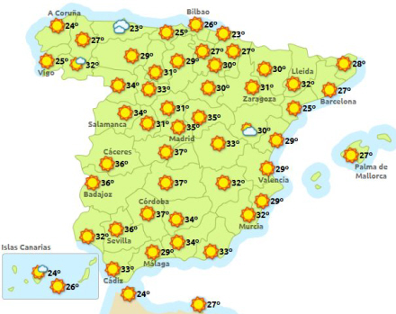Vejret for i dag ser således ud: Madrid får sol og mellem 20 – 35 grader, Barcelona letskyet med mellem 21 - 27, Valencia solrigt og 22 – 29 grader, og det samme i Málaga dog lidt varmere med mellem 24 – 33 grader.