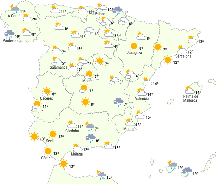 Den Iberiske Halvø og De Baleariske Øer vil fortsat være under indflydelse af flere atlantiske fronter, og det betyder letskyet eller skydække i begyndelsen af dagen, men der er tendens til opklaring i løbet af dagen undtagen i den nordvestlige del, ved Cantábrico og de østlige af De Baleariske Øer. Opklaringen skal dog nydes, for der er igen tendens til overskyet himmel med ankomsten af en ny front.
