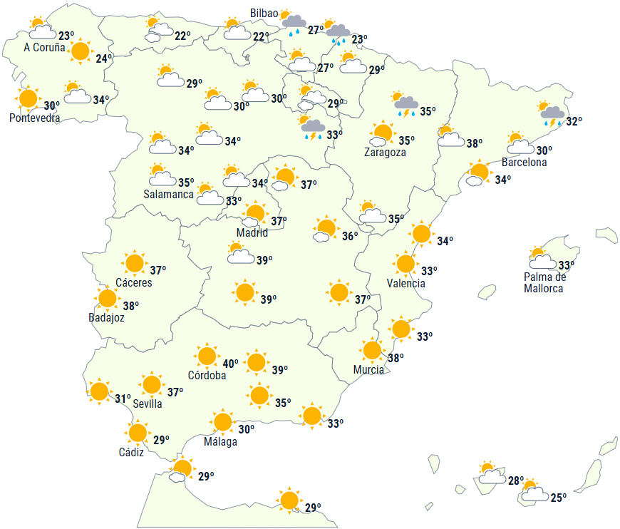 - Meget høje dagstemperaturer i den sydlige halvdel af det nordlige højland, den nordøstlige del af Den Iberiske Halvø, Rias Baixas og den sydlige halvdel af Den Iberiske Halvø, hvor der forventes 34 til 36 grader - lokalt endnu højere. Temperaturen kan overstige 40 grader i Guadalquivir-dalen, Tajo-dalen, Guadiana-dalen og Extremadura.