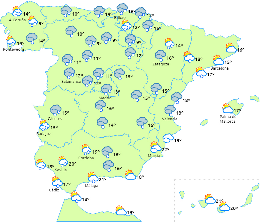 Der kan lokalt falde kraftig regn i det vestlige Galicien og vedvarende regn i Cantabriske område. Om eftermiddagen kan de være ledsaget af tordenvejr i det indre sydøstlige område af den iberiske halvø. På Balearerne og Alboran er der risiko for spredte og lejlighedsvise byger. På De Kanariske Øer er det overskyet med en lav sandsynlighed for lette byger i den nordlige del af øerne med større relief.