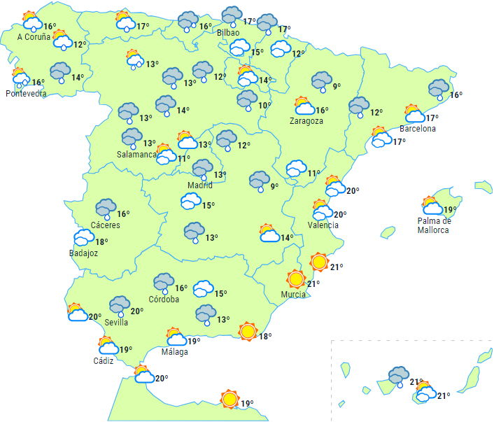Skyet eller perioder med det over det meste af resten af halvøen og Balearerne, med mulighed for nogle byger, ledsaget af tordenvejr på Balearerne, men generelt er nedbøren svagere og mere spredt jo længere mod syd og øst, vi kommer. Der forventes således ikke regn til den sydvestlige del af Andalusien eller i Middelhavsområdet på halvøen.