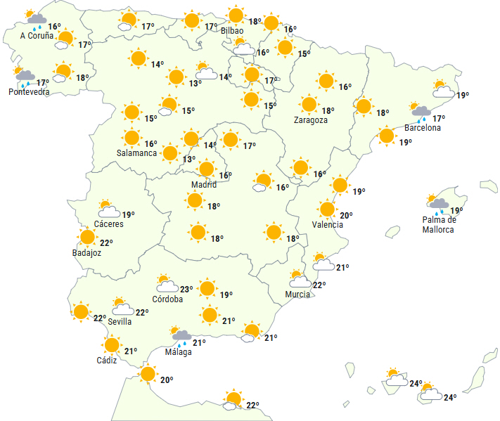Der forventes stabilt vejr på størstedelen af Den Iberiske Halvø, med klar eller skyfri himmel. Dog vil fugtig vind fra Middelhavet give overskyet himmel eller perioder med det helt i nordøst og sydøst samt på De Baleariske Øer. Det skaber sandsynlighed for lejlighedsvise byger, der påvirker øerne og kysterne i Catalonien, men det kan heller ikke udelukkes i den sydlige del af Valencia Regionen, Murcia og Almería.