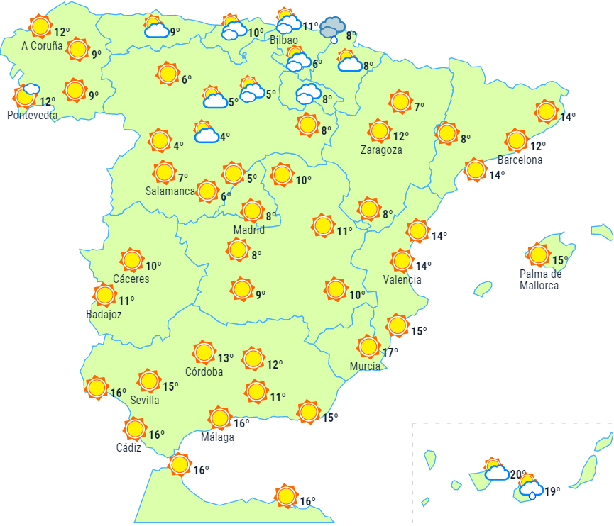 Frosten vil aftage i intensitet, selv om den fortsat vil være omfattende og dække bjergområder og dale i halvøens indre egne, men det skulle holde sig på den rigtige side af nul i Ebro-dalen og det sydvestlige område.