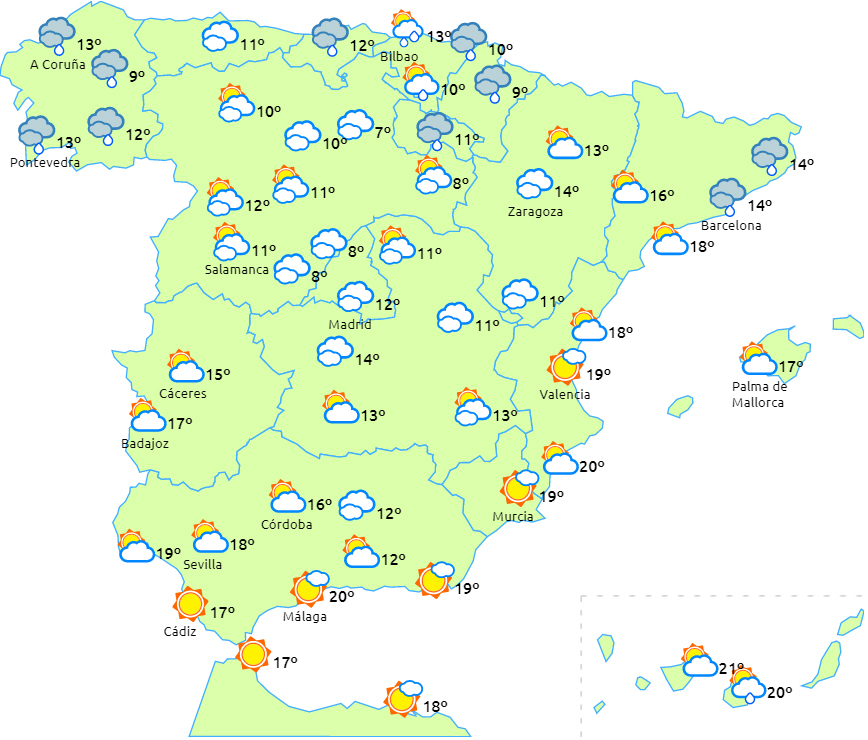 Maksimumtemperaturerne vil stige i Middelhavsområdet og falde i resten af landet, dog ingen væsentlige ændringer på De Kanariske Øer. Minimumstemperaturerne vil falde næsten overalt i landet, men mest markant i halvøens indre egne. Svag frost i de centrale og nordlige bjerge, lokalt mere intens i Pyrenæerne.