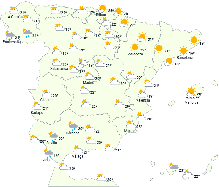 Der vil fortsat være generelt stabilt vejr på Den Iberiske Halvø og De Baleariske Øer, der er under indflydelse af et højtryk centreret nord for halvøen.