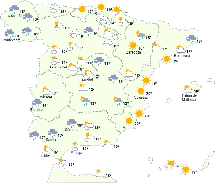 Dagstemperaturerne stiger på De Kanariske Øer og på det meste af den østlige halvdel af halvøen, mens de forbliver uændrede i resten af landet.