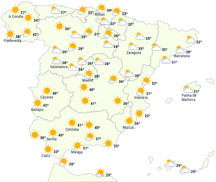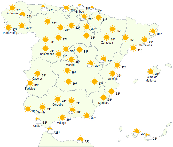 Temperaturerne ventes at ligge på 34 til 36 grader næsten overalt i det indre af Den Iberiske Halvø samt i Rías Baixas og visse steder ved Alborán. Der forventes endda 40 til 42 grader på store dele af den sydlige halvdel af den atlantiske side og den sydlige del af Galicien.