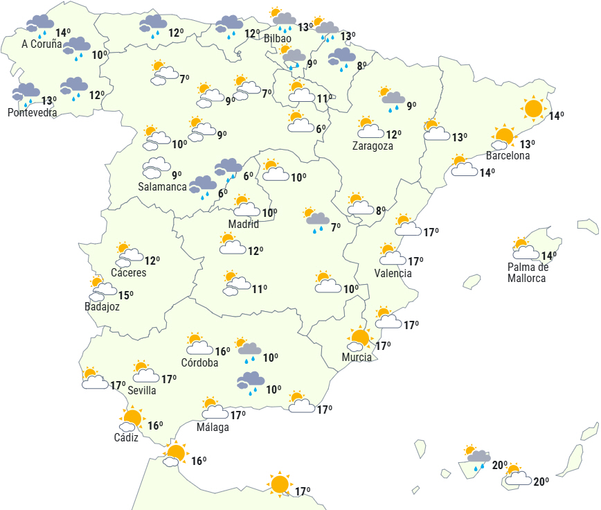 Vejret præges af flere fronters passage hen over halvøen og De Baleariske Øer, så det betyder overvejende skyet eller overskyet himmel med nedbør i det meste af området.