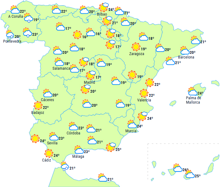 På samme måde vil byger og tordenvejr sandsynligvis fortsætte i den nordlige halvdel af Middelhavsområdet, Navarra og Aragón, men det kan også ramme i sydøst, Gibraltarstrædet og på De Baleariske Øer. Lokalt kraftige og/eller vedvarende ved kysten og de kystnære områder i Catalonien og den nordlige del af Levante, og så muligvis i Pyrenæerne og Huesca sidst på dagen.