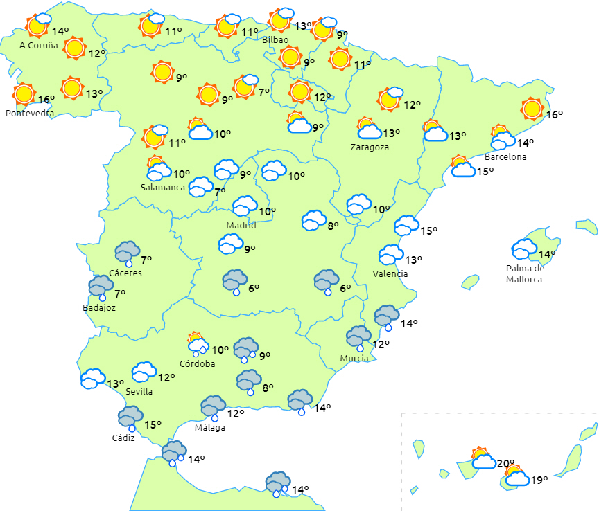 En Atlanterhavsfront i nærheden af Cádizbugten bevæger sig østpå, og det giver skyet eller overskyet vejr over den sydlige halvdel af halvøen og på Balearerne med regn og byger, som vil være mere sandsynlige og mere intense, jo længere sydpå vi kommer. Der forventes lokalt kraftige regn- og tordenbyger i den sydlige halvdel af Andalusien.