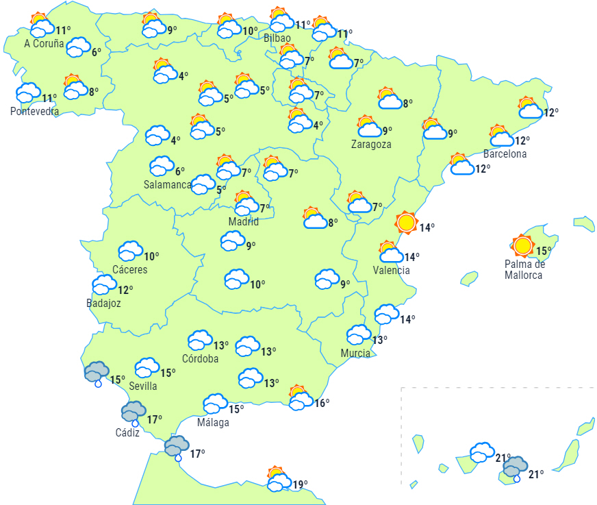 Temperaturerne vil falde i det meste af landet, undtagen på den sydøstlige tredjedel af halvøen og De Kanariske Øer, hvor temperaturerne vil stige. Der forventes svag frost i store dele af indlandsområderne på den nordlige halvdel af halvøen og den nordøstlige del for det sydlige højland. Frosten bliver mere intens i bjergene, endda tung i Pyrenæerne.