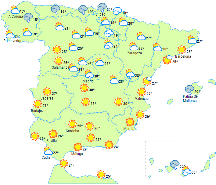 Maksimumstemperaturerne vil falde i Rías Baixas, på den sydlige tredjedel og indlandet på De Kanariske Øer, mens de vil stige i det centrale nord, nordøst og på De Baleariske Øer, men især i den øvre del af Ebro-dalen. Temperaturerne kan overstige 36 grader i det meste af Atlanterhavsområderne og Ebro-dalen, og vi kan endda ramme 40 grader i områder af Tagus, Guadiana og Guadalquivir.