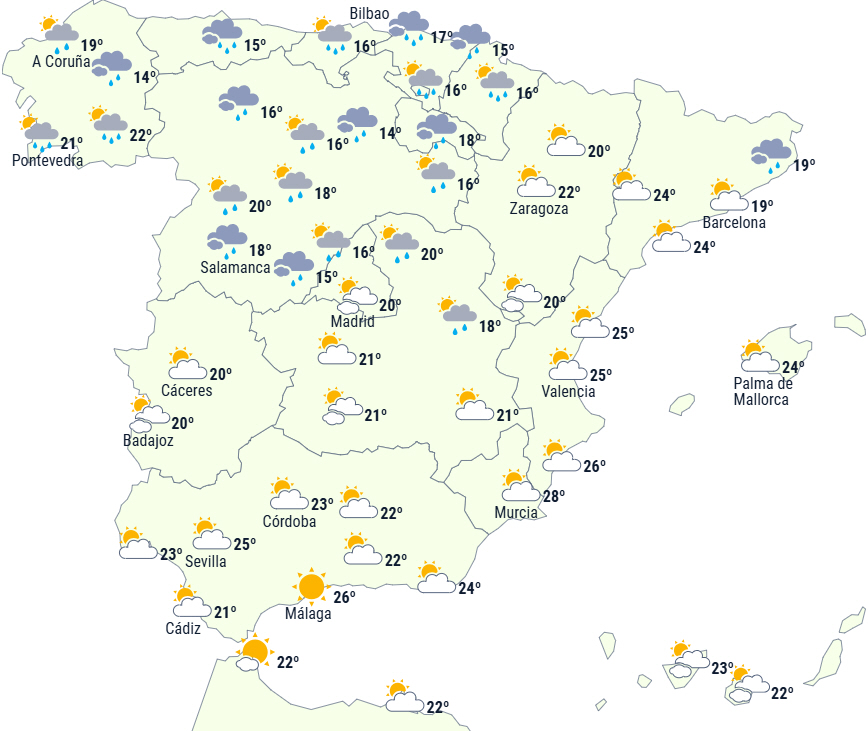 På Den Iberiske Halvø og De Baleariske Øer vil en ny Atlanterhavsfront nærme sig og trænge ind over det nordlige område, og det betyder udbredt skydække og sandsynlighed for nedbør, der spreder sig sydpå.