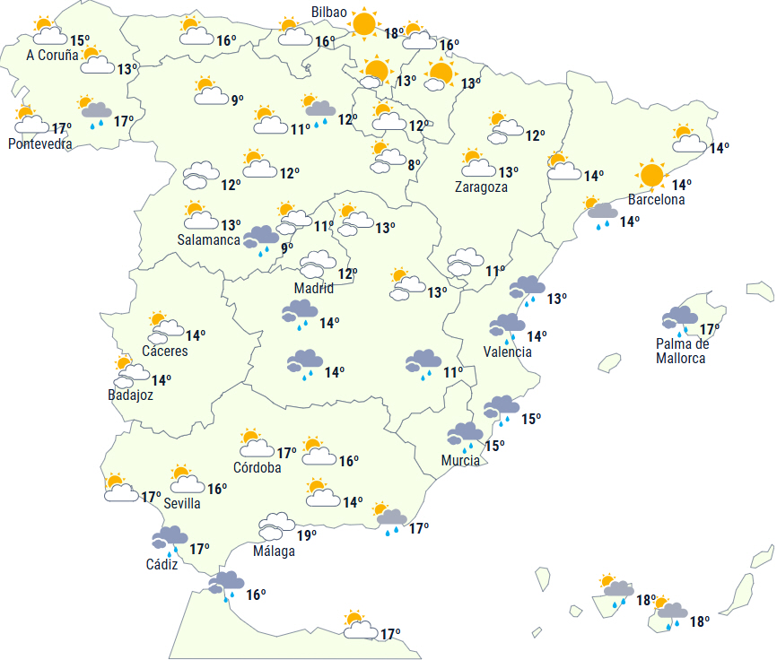 Ligesom den foregående dag forventes ustabilt vejr på Den Iberiske Halvø med skyet eller overskyet himmel og udbredt nedbør, bortset fra det nordlige område.