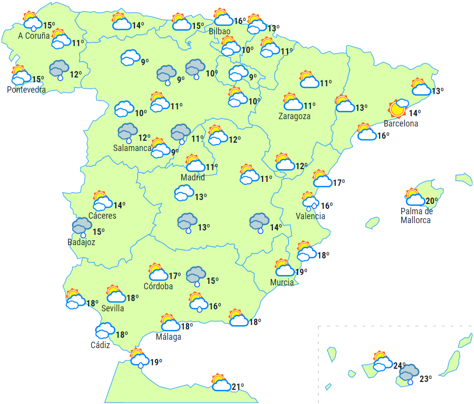 Dagstemperaturerne falder i det østlige Andalusien, men vil ellers stige på det meste af halvøen. Nattemperaturerne vil stige på det meste af halvøen og ellers kun få ændringer på øerne. Der forventes kun let frost i Pyrenæerne.
