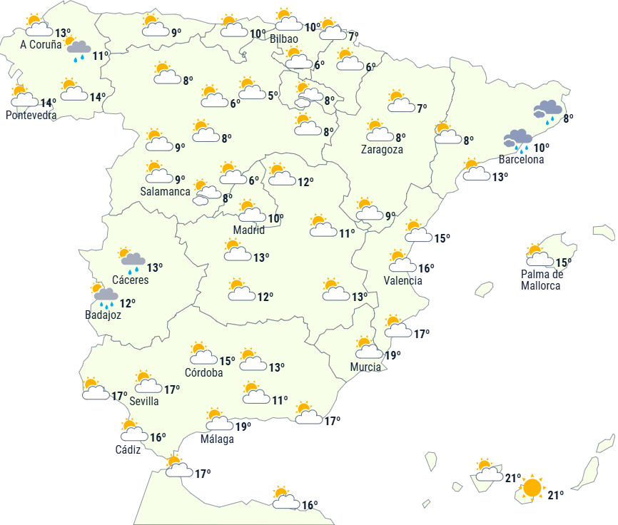 Frost vil fortsat påvirke store dele af det indre af det nordlige Spanien, samt bjergområder i sydøst og østlige dele af den sydlige højslette. Svag frost kan også forekomme på Mallorca.
