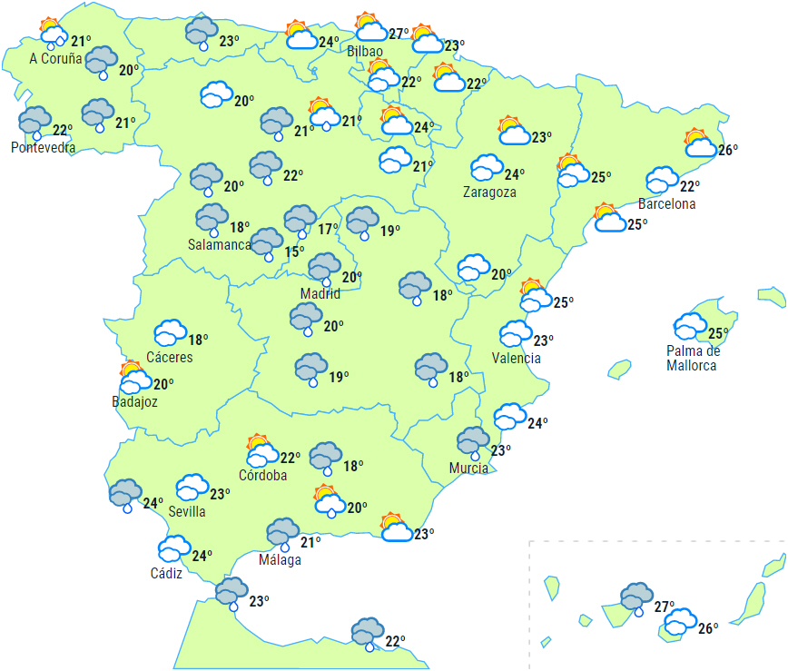 Hvad angår halvøen og De Baleariske Øer, vil det generelt blive lidt mere stabilt sammenlignet med de foregående dage med overvejende lette eller lavthængende skyer fra om formiddagen, men stadig med en del skyer i løbet af dagen. Byger og tordenvejr især om eftermiddagen i bjerge og omkringliggende områder, som især vil påvirke den nordlige halvdel af halvøen og den østlige tredjedel, selvom de vil være mindre intense og omfattende end de foregående dage.