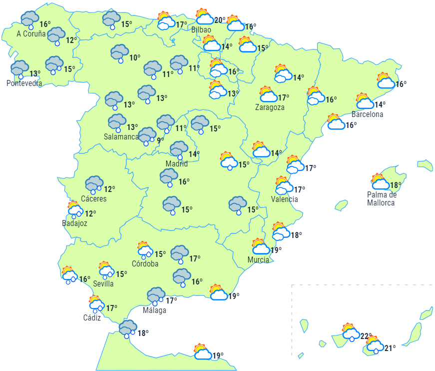 Sidst på dagen er der udsigt til gråvejr og nedbør i dele af Galicien. Måske også lidt byger til den østlige del af Catalonien.