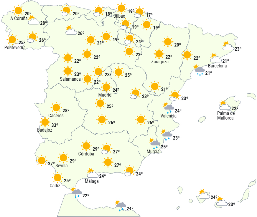 Der vil også være skyet eller helt overskyet himmel over andre dele af den sydøstlige del af halvøen, samt perioder med skyer over den nordlige del af Galicien, Cantabrien og det øvre af Ebro-dalen, men efterhånden generelt tendens til opklaring i det meste af landet bortset fra den helt sydøstlige del.