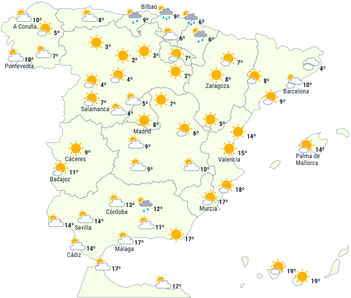 Minimumstemperaturerne falder særligt på Balearerne, ved Alborán og Gibraltarstrædet, mens frosten fortsat vil påvirke bjergområderne og den østlige del af højlandet. På Mallorca kan frost heller ikke udelukkes i bjergområderne.