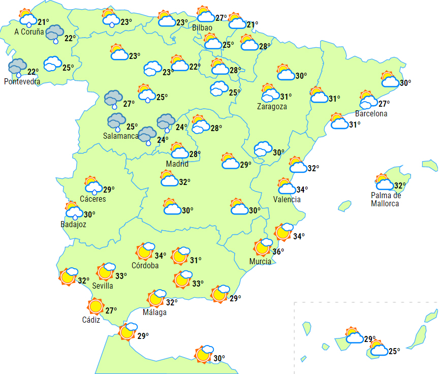 Temperaturerne vil falde på det meste af den nordlige halvdel af halvøen og kun få ændringer i resten af landet. Vi kan stadig overstige 35 grader i dele af Valencia og Murcia.