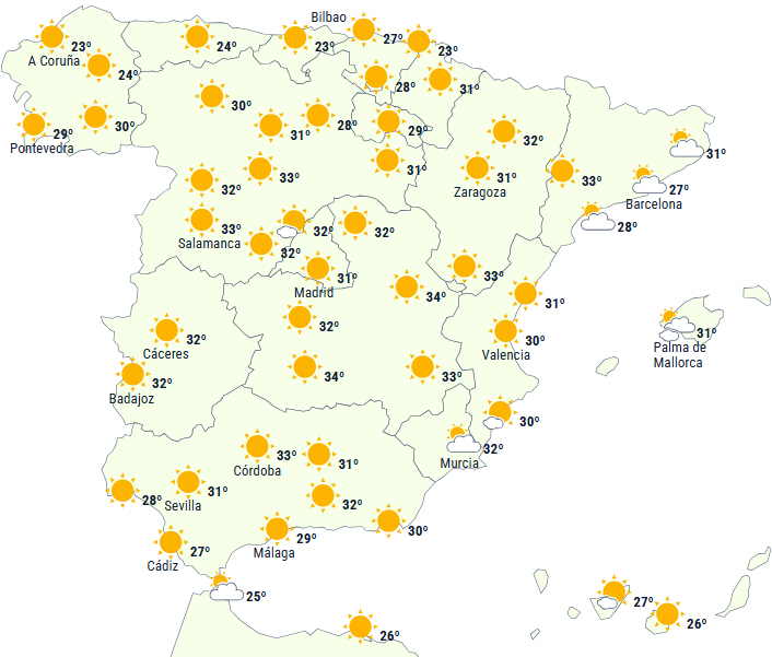 Temperaturen ligger på 34 til 36 grader på størstedelen af Den Iberiske Halvø samt på begge øgrupper, men den kan komme op på 40 grader på store dele af den sydlige halvdel af den atlantiske side og i de nordøstlige dale.