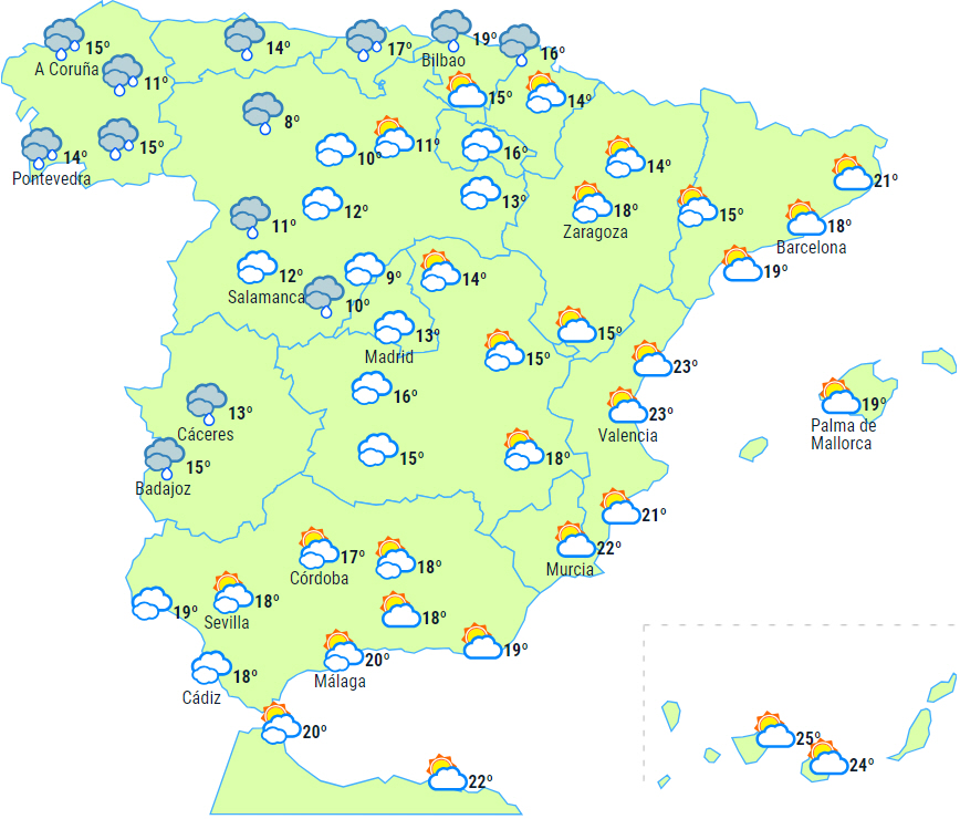 Dagstemperaturerne har tendens til at falde på den vestlige tredjedel af halvøen, mens der kun sker små ændringer i resten. Nattemperaturerne har tendens til at stige, undtagen i Andalusien og Middelhavsområdet. Frost forventes at være begrænset til Pyrenæerne.