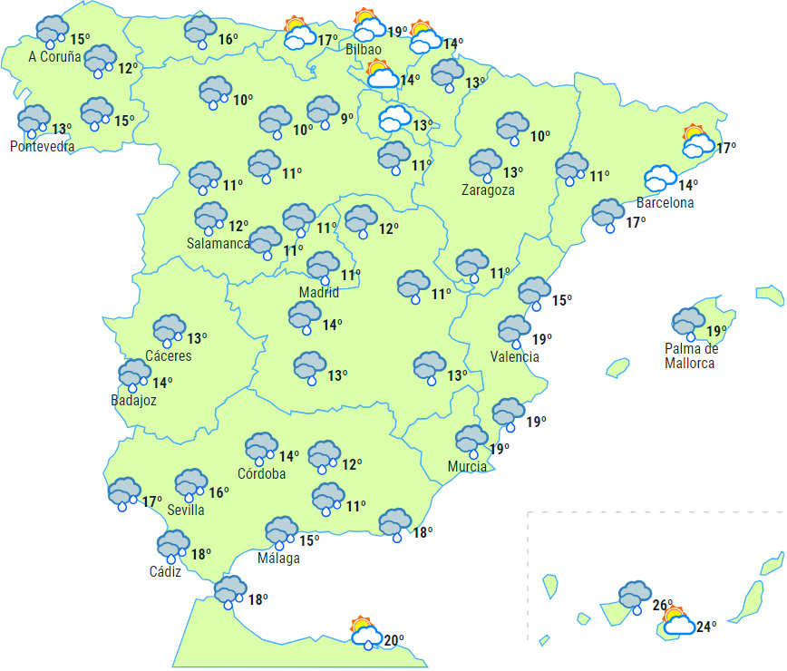 Letskyet himmel, tiltagende til skyet eller overskyet i løbet af eftermiddagen. Let regn sidst på dagen er ikke udelukket, men det skulle dog holde tørt i Axarquía. Temperaturer med små ændringer på 17 til 21 grader og fire til 11 i nat.